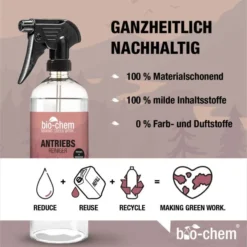 Freunde des aktiven Radsports aufgepasst! Vorbei mit zeitaufwendigem und nervigem Reinigen und Schmieren der Fahrradkette! Mit dem bio-chem Antriebsreiniger reinigst und schmierst Du Deine Fahrradkette und das Kettenritzel in einem Schritt – umweltfreundlich und effizient. Das Mittel riecht dabei nicht streng und ist natürlich kein bisschen aggressiv, so wie es viele herkömmliche Kettenreiniger sind. Trotzdem ist der bio-chem Antriebsreiniger extrem wirkungsvoll und auch auf Aluminium bedenkenlos verträglich.