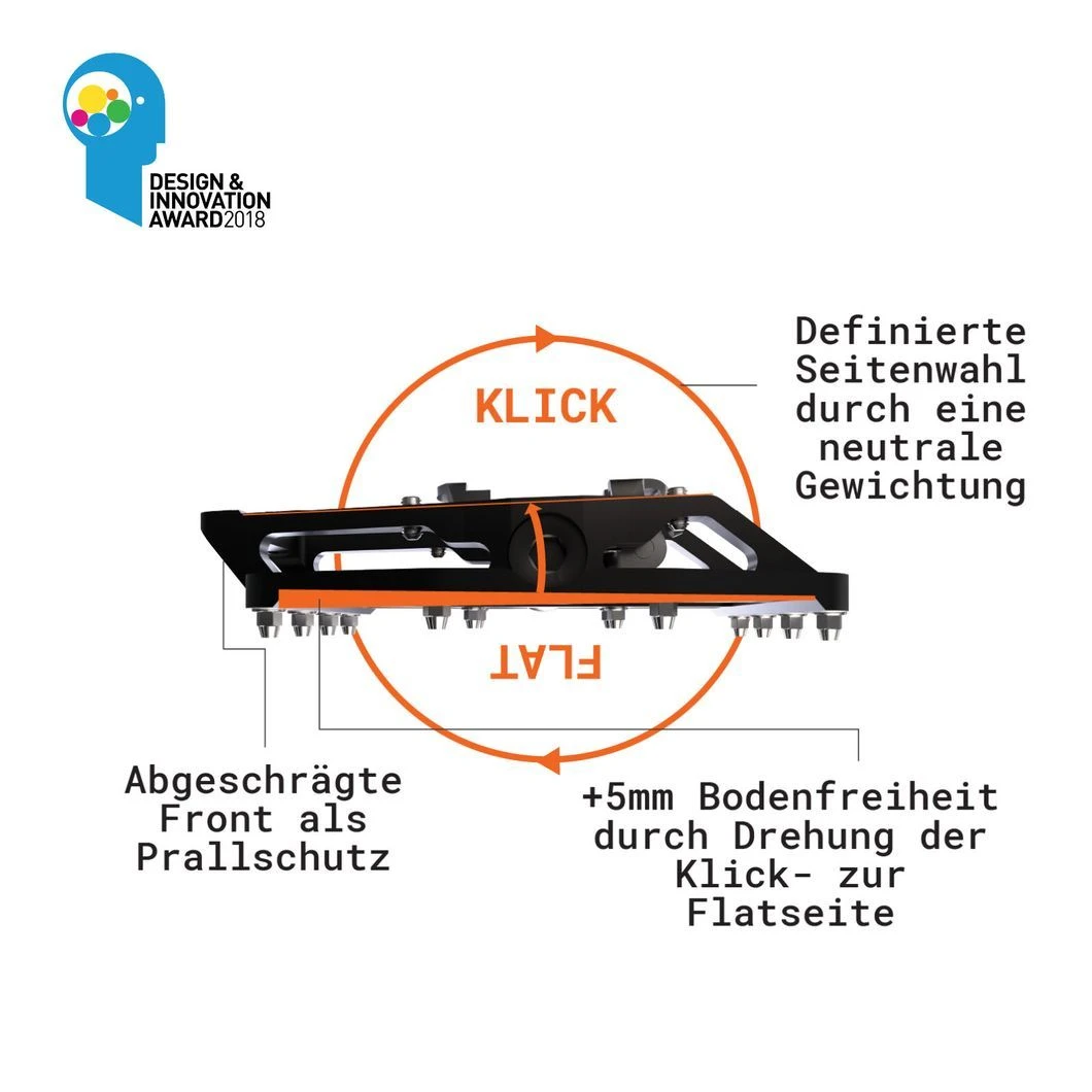 FĂŒr eine optimierte Bodenfreiheit ist die Flat- zur Klickseite um 2,5° gedreht, was die Bodenfreiheit an den entscheidenden Stellen um 5mm erhöht.Â